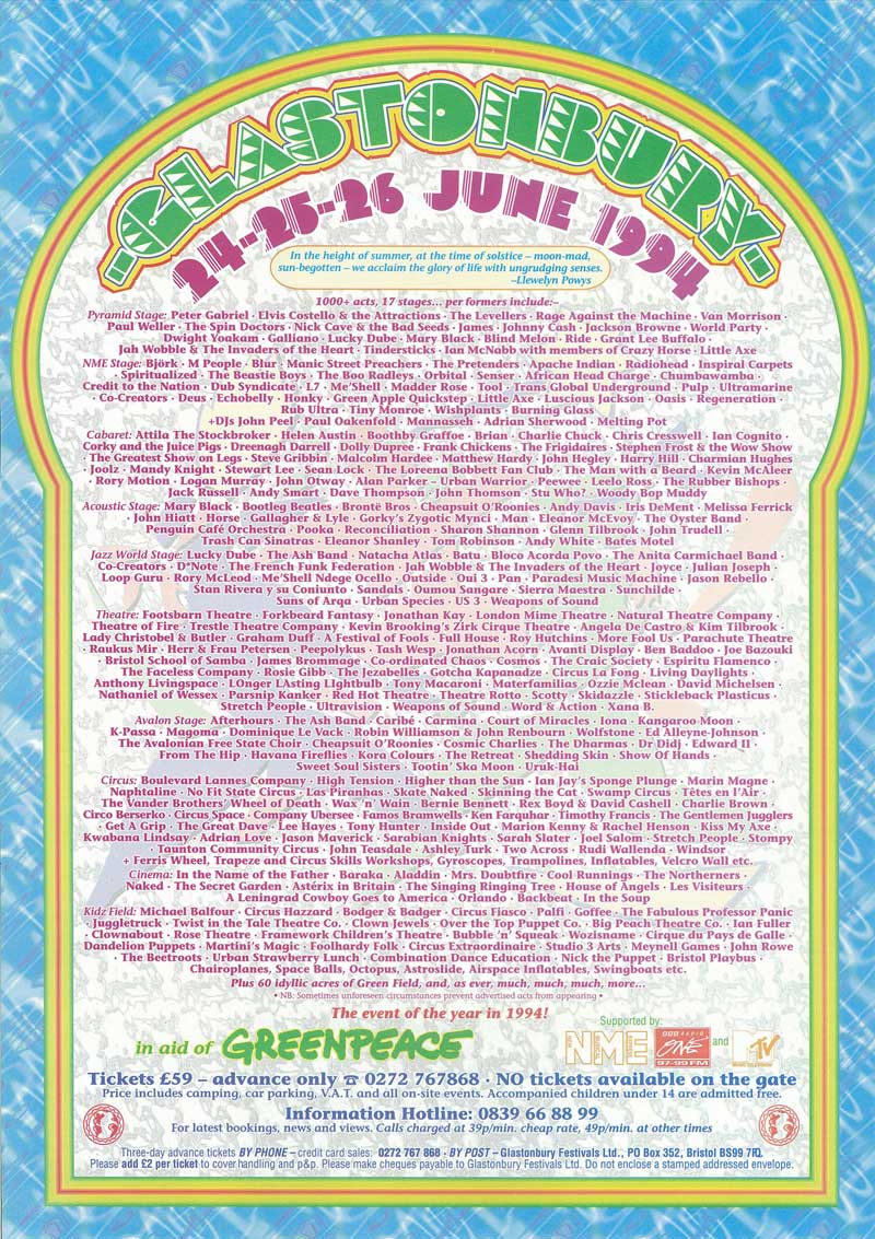 Music wise, the line-up reads like a litany of 90s genius – Radiohead, Blur, Björk, Rage Against The Machine, Peter Gabriel, Nick Cave and The Bad Seeds, Elvis Costello, Pretenders, Pulp, Blind Melon, Manic Street Preachers, Jackson Browne, Beastie Boys, James, Paul Weller, Spin Doctors, Chumbawamba, Spiritualized, Elvis Costello And The Attractions, Orbital, Nick Cave, The Lemonheads, Dwight Yoakam, Ride, Meshell Ndegeocello, Tindersticks, M People, L7, Levellers, World Party, The Boo Radleys, Oasis, St. Etienne, Grant Lee Buffalo & Echobelly.