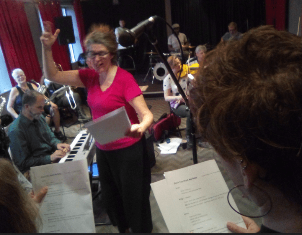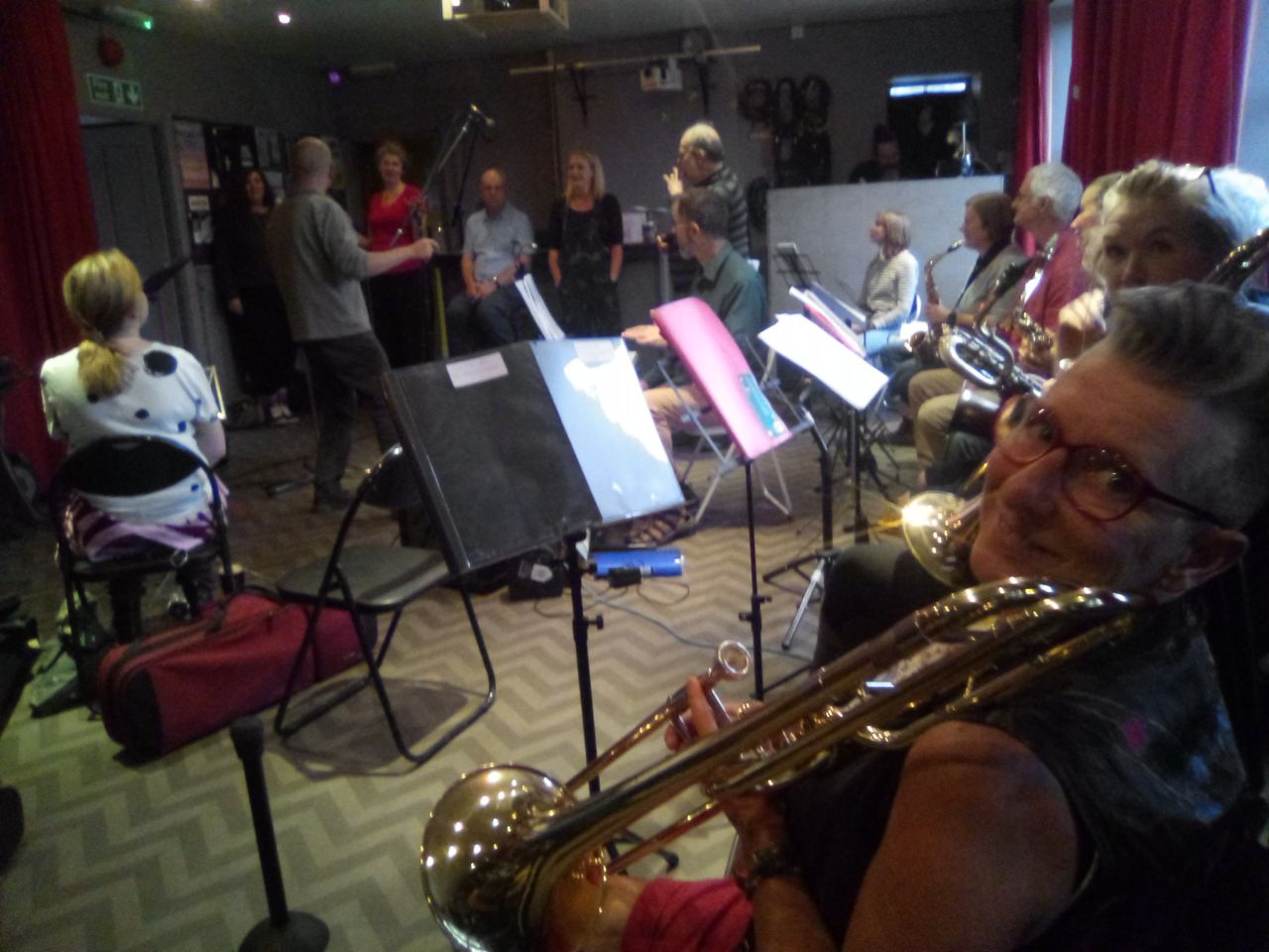 They warmed up with a jazz-infused piece of random razzmatazz which David conducted like Tony Blair on acid, & when he wiggled his fingers at the wind section I was ‘like what kind of sorcery is this?’ Then we divided up for a while, the instruments buzzing about like bees on the bouquet-like interactions of energized razzmatazz, while next door choir leader Jan tightened the singers up into SAS precision. The orchestra was comprehensive; strings, brass & wind – guitar, bass & drums among which Lady Fee’s bass trombone held everything together, the veritable & vital glue of the CFO. Outside Jan was teenage-giddy, yet matron-efficient, as she guided us through ‘Don’t You Love Me Baby.’ This was one of 200 songs which Jessie has transcribed for orchestra, from which pool the CFO will be choosing their pieces. The idea is that a member of the Bristol or Paris Fantasy Orchestras can just slot into the CFO, & vice versa.