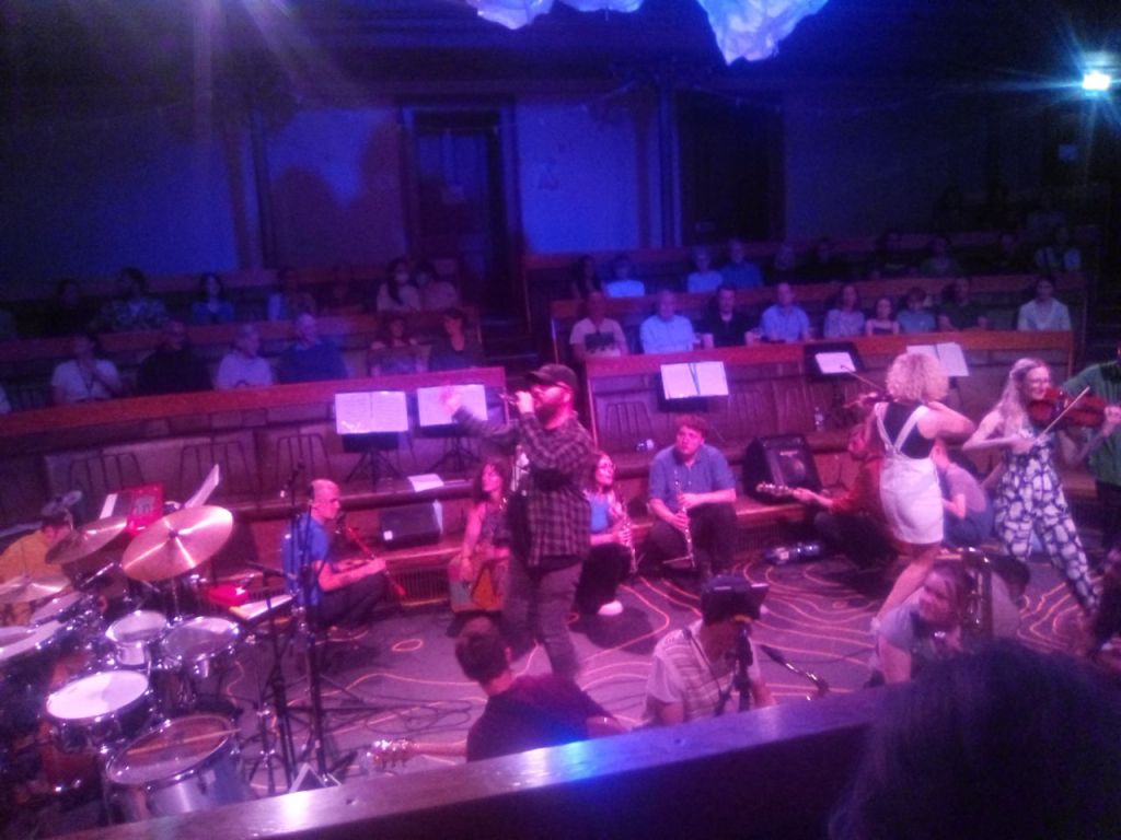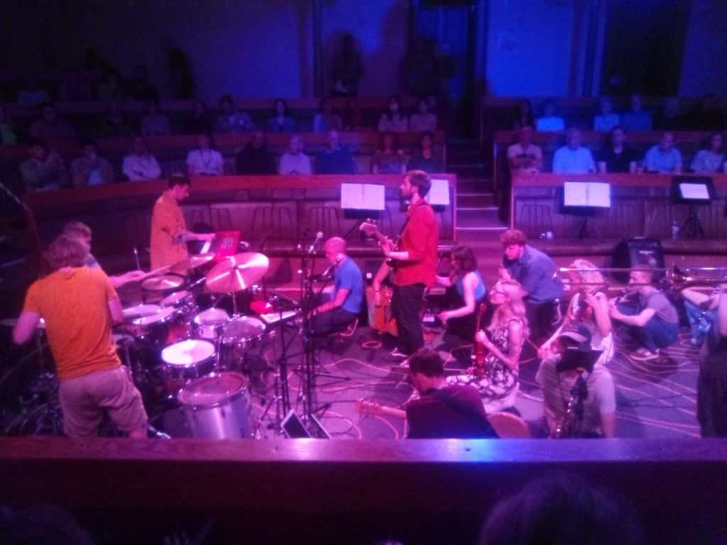 We went to watch the Tinderbox Orchestra, with all their youthful bohemia & unusual collaborations, in what was once going to be the debating chamber of the Scottish parliament, but was usurped by the modernist monstrosity of Holyrood. As an arena its stunning – a colosseum of seat around an oval floor into which the orchestra ducked & dived & swooped & skirmished as they played the scruffy-scraggly, tight-as-fu£k Baudelair bop, The ‘Fleur de Mals, erupting from every squatting gargoyle.
