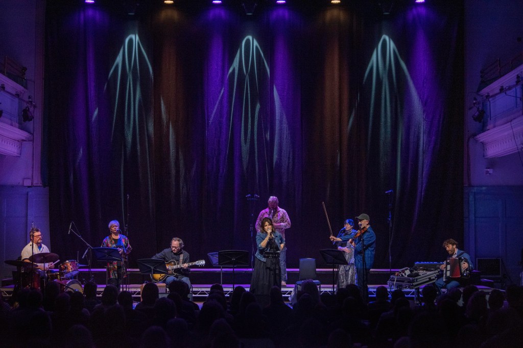 Presented by The Queen’s Hall and the Soundhouse Organisation As I took my seat for this evening of groundbreaking musical excellence the ambience of The Queens Hall relaxed me, the stage bathed in a beautiful blue light and with a capacity audience in collective excitement and anticipation of what was to come. The enormous in numbers and talent, Soundhouse Choir took to the stage. Introduced and directed by Heather Macleod The Queen’s Hall was filled with vocal harmony with beautiful renditions of John Lennon and Yoko Ono’s “Starting Over, followed by Moloko’s “Sing It Back With Inge Thomson on electronic treatments, Keyboards and beautiful vocals taking the lead for the final song from this art house massive, Anise Pearson joined the collective as The Queen Of Harps, to deliver a beautiful piece called Fractured Hearts, dedicated her late Mum, Heidi Exquisitely moving, angelic harmonies of musical grace.