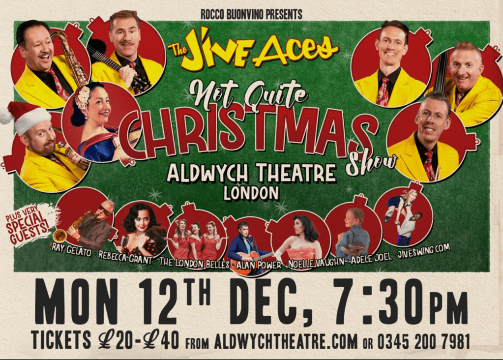 I’m a fan of the Jive Aces, me. I’ve only seen ’em once, mind, up at the Edinburgh Fringe, but I thoughy they were well cool. Acutely professional, yet immensely approachabe, these are amenable swing merchants, who know just where to find our audio g-spots & get us reyt going. Anyways, a pal of mine, tonight’s photographer, has a daughter who just happens to be among the occasional singers who adorn the Aces’ canary-black stage, & so when we discover’d she would be doing a one-off festive show at the Aldwych Theatre in London, it would have been foolish not to accept the invitation to witness, ‘The Jive Aces Not Quite Christmas Show.’