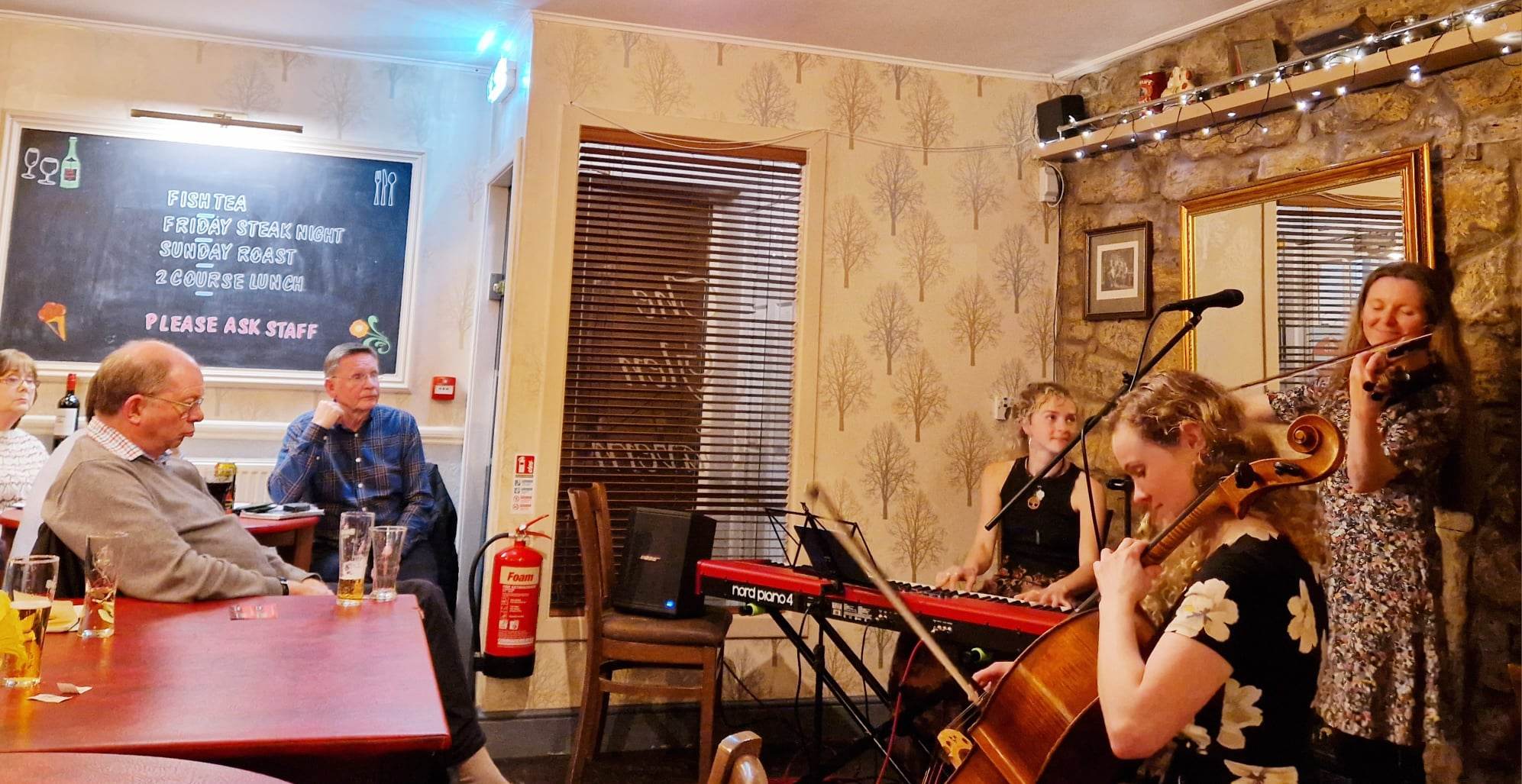 The Glen Tavern plays host to ‘Dunfermline Folk Club’, & a fitting setting it is too. The cosy, wood panelled interior & warm hubbub of chatter fixed me with a Proustian rush, back to ceilidhs of my childhood in Portree & Dunoon, up through more recent sessions watching my mum lead sessions at the sadly departed Uisghe Beathe in Glasgow. A nostalgic pint of McEwans 80/ in hand, I nestled down at a table of the Clubs regulars as the warm up finished & the trio retreated behind a curtain concealed store room in this, the Tavern’s Lounge bar. It’s a glamorous life touring ‘Trad’.