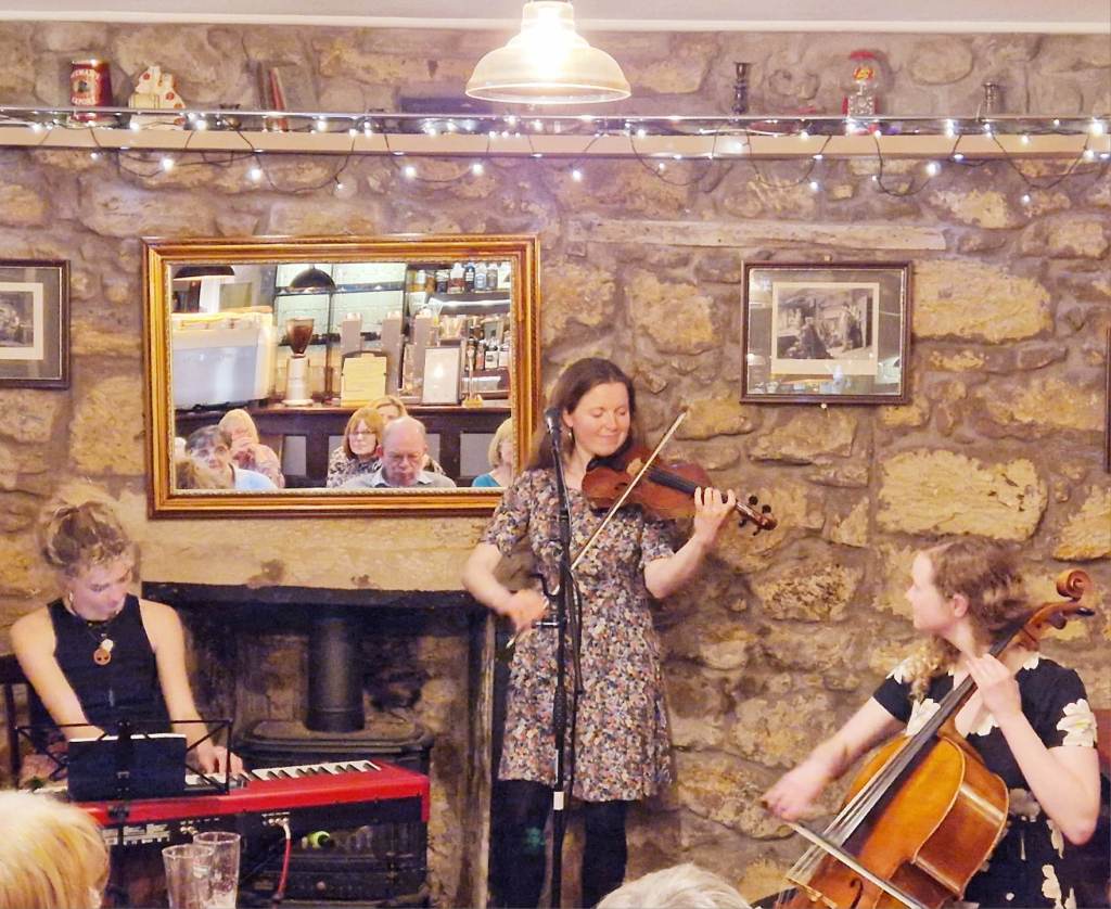 There were some covers, and ‘King of Birds’ allowed Ellen to further demonstrate her flair as a truly unique performer, curious and apposite squeals of ‘false harmonics’ comparable in their allegorical expressiveness to an avian ‘Flight of the Bumblebee’. The Trad sections are enlivened by delightfully lively keyboard playing, with Iona throwing minor notes in at all the right moments to adroitly emulate the role of accordion. The first half closed with ‘Young Jamie Foyers’. In other hands this can be a trite & anodyne dirge. Instead, our trio leave the crowd heading for the bar with tears in their eyes, as the tune serves to impress once again their talents at composition, harmonies, and a startling ability to wring emotion out of every note.