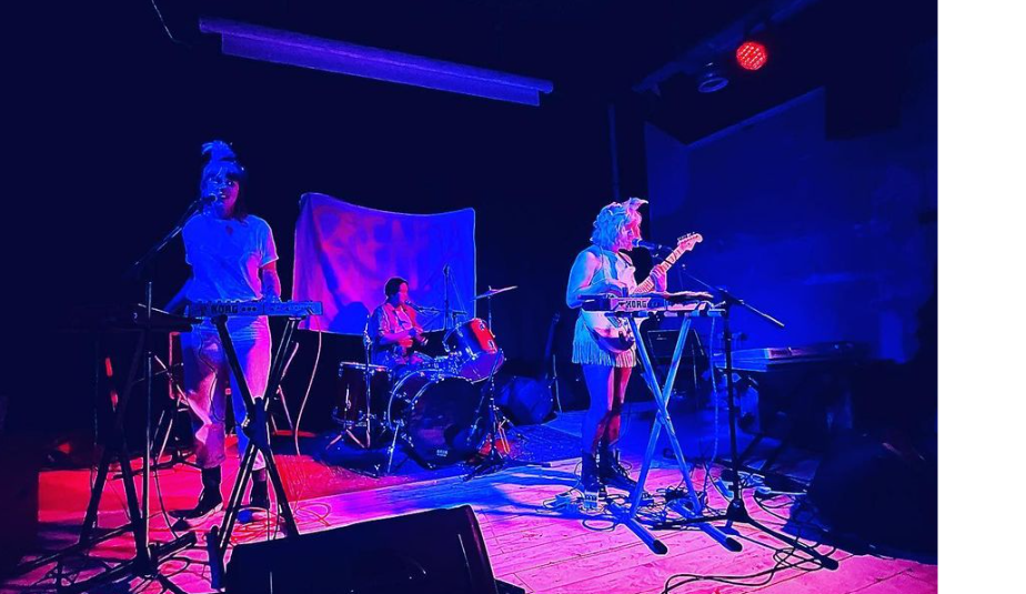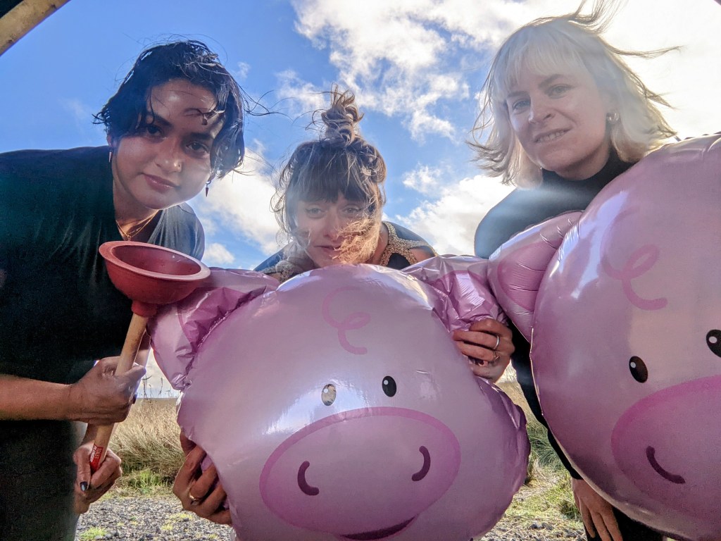 What’s your role in the band?. L: So my name is Litty and I do guitar, weird sounds. A: Apsi does – talk about myself in third person. Does the drums. We all sing. F: Yeah, we all sing like angels. Flore plays two synthesizers in the band. A: You play to them. It sounded, because you said to, but to me in my head I was like you play to them. F: I play to the synthesizers in the room. L: On a desert island. F: That’s what I do.