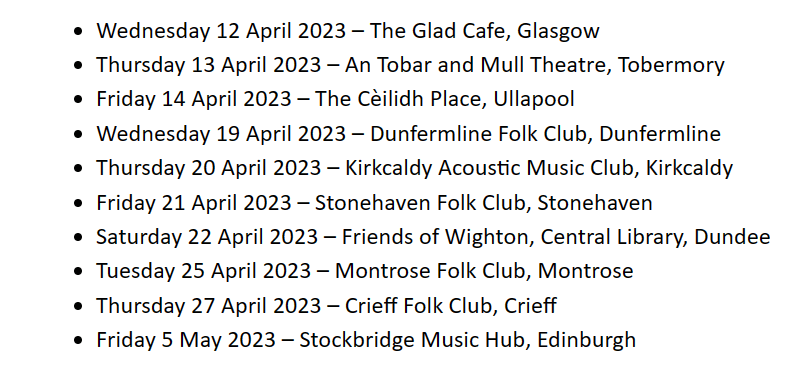 What does the rest of 2023 have in store for Isla Ratcliff? I have plans to record some songs – either an EP or a full album. I have several gigs of my own music in June and July – Edinburgh Folk Club, Solas Festival, Stirling Folk Club, and Lyth Arts Centre Summer Sessions. I also have several gigs this summer with two other bands – The Outside Track and Smash Kafana. I hope to tour again in spring 2024, and I have an exciting project planned for 2025 – keep an eye on my social media and website!