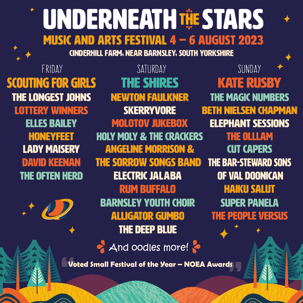 As ever, Stars is more than just a folk festival. Friday night has the hit pop act Scouting for Girls, currently touring with Olly Murs and we are very excited to have Lottery Winners, who at the time of writing are #1 in the Album Charts – that kind of booking foresight is what we like! We also have The Longest Johns, the sea-shanty band who went viral with “Wellerman”. Saturday has the amazing double bill of The Shires and Newton Faulkner, as well as world dance act Molotov Jukebox and Skerryvore – they are currently #1 in the Scottish music charts!. Sunday is our very own Kate Rusby, The Magic Numbers, plus Beth Nielsen Chapman and the wonderful Elephant Sessions to close. However, there is so much more depth than the more well known names. I am really looking forward to Angeline Morrisson – her album telling the story of the much unreported Black experience in British Folk was one of the most moving of last year. We’ve also got an amazing French-Latin band called Super Panela kicking off the main stage, who are going to be wonderful. In addition we have jazz, Moroccan trance, blues, and a full choir!