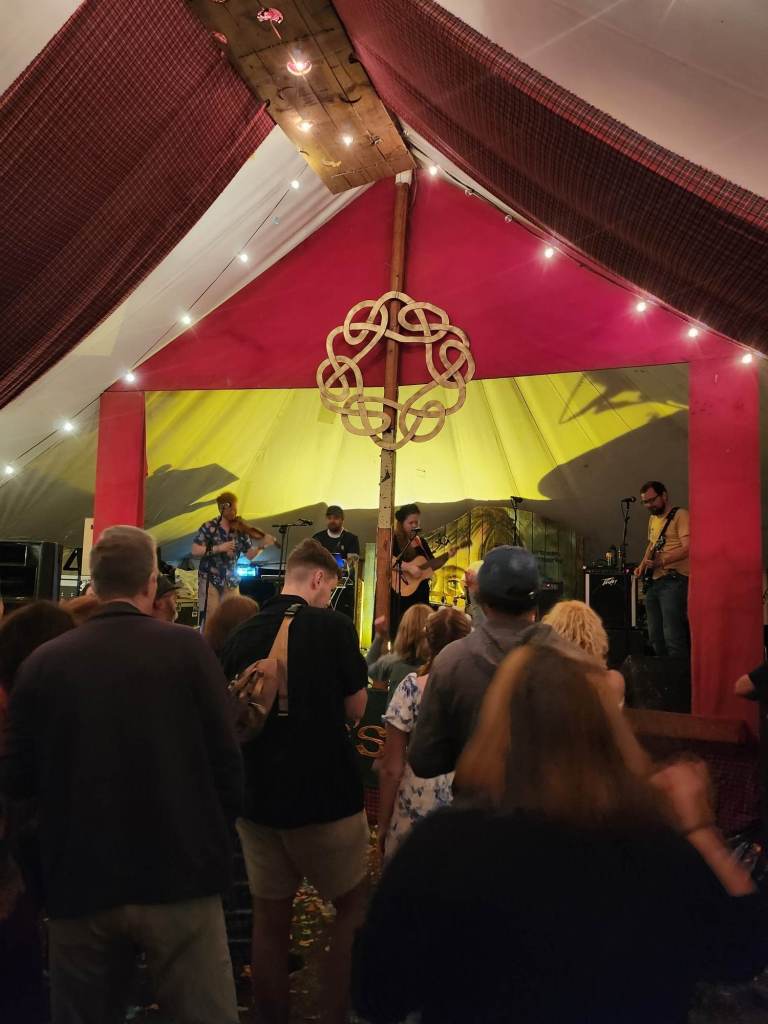 The night sky was clear as a result the temperature dropped quite dramatically as nighttime fell. I was still wearing shorts. Just as I played my first tune, I gets a text from HQ saying put no more wood on the fire and let it die oot. Multi-tasking DJ??? So I got the message out to Ross and Jim, I was looking forward to a roaring fire, but understood why that wasnae going to happen. It was a cold night and a dwindling flame with a massive woodpile was going to be a hard thing to manage. Ross and Jim did a brilliant job. Again I headed to my tent at 4am to alleviate exhaustion. I knew that the Fire Place had to be cordoned off and clear signage put in place.