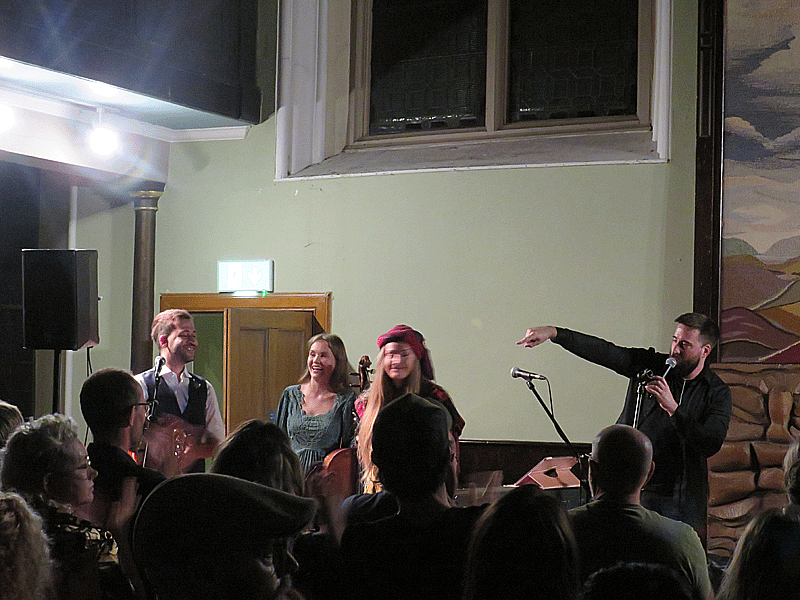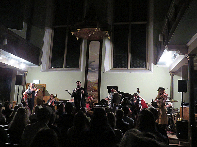 Saint Marks Church on Castle Terrace Edinburgh had the privilege to play host to Jamie Irrepressible , also known as The Irrepressibles. The singer / songwriter and has 7 piece band consisting of Elliot Lyte (Violin), Charlotte Stock (Viola) , Rebecca Thomas (Cello) , Alice Phelps (Double Bass), Anja Kadir (Accordion, Clarinet and Backing Vocals), Sarah Kershaw (2nd Piano, Vocals, Organ & Clarinet), Thomas Twemlow (Folk Kit and Percussion); and on the Lead Vocals, Piano, Mandolin and Acoustic Guitar, Mr. Jamie Irrepressible.
