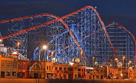 So I was off on a romantic birthday surprise trip to Blackpool, to where we caught a train at Preston.. As it was so packed after the free festy, the conductor never came & soon we were soon searching for a B&B in the English Vegas. As it was so packed the conductor never came & soon we were searching for a B&B in the English Vegas. Finding a suitably cheap & cheery one, we rushed to the Pleasure Beach for a birthday go on the recently opened Big One. It had put the Pleasure Beach back on the map after a decade of Alton Towers’ supremacy & was – for a while – the tallest roller-coaster in the world. It was also a good place to splice a wee snog with your girlfriend with innuendos about big ones – teenage foreplay at its most effective.